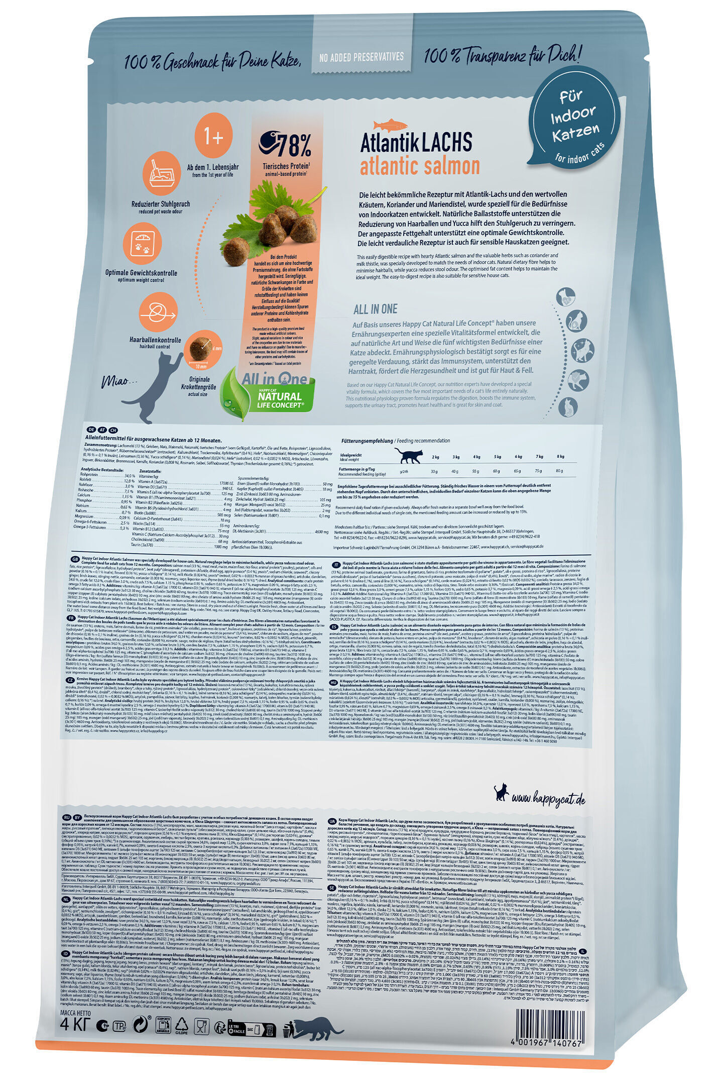 Koty domowe często poruszają się mniej niż koty wychodzące na zewnątrz i nie mogą odpowiednio wykorzystać energii, którą spożywają. Może to prowadzić do nadwagi w dłuższym okresie czasu. Karma Happy Cat Indoor Atlantic Salmon zawiera tylko 12,0% tłuszczu i dostarcza sycącego błonnika, który zapewnia długotrwałe uczucie sytości. Twój kot będzie czuł się najedzony i zachowa szczupłą sylwetkę. Ponadto nasza karma dla kotów domowych ma wyższą zawartość białka, dzięki czemu zapotrzebowanie na białko Twojej aksamitnej łapy jest nadal odpowiednio pokrywane przy zmniejszonej ilości karmy.