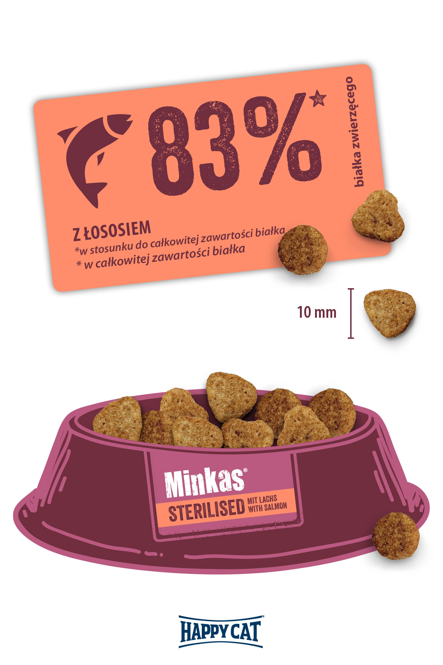 Starannie dobrana receptura z pysznym łososiem dostarcza Twojemu kotu cennych kwasów tłuszczowych omega-3 i omega-6, zapewniających zdrową skórę i lśniącą sierść. Zawarta w karmie juka może nawet zmniejszyć nieprzyjemny zapach odchodów. Oprócz doskonałego smaku, Happy Cat Minkas Sterilised dostarcza wszystkich ważnych składników odżywczych, których Twój kot potrzebuje, aby prowadzić aktywne życie jako kot wykastrowany. Starannie skomponowana receptura Happy Cat Minkas jest oczywiście wolna od sztucznych aromatów i konserwantów.