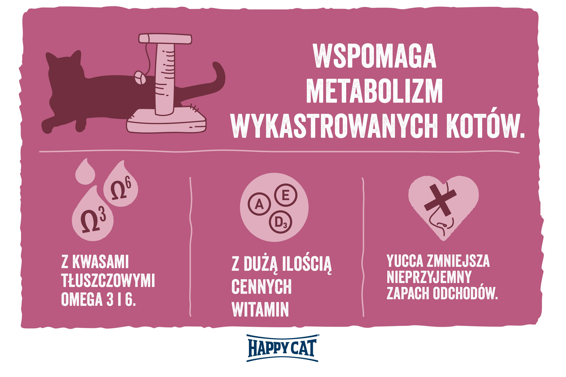 Happy Cat Minkas Sterilised z łososiem to dobra karma sucha, specjalnie dostosowana do potrzeb kotów wykastrowanych o zmniejszonym zapotrzebowaniu energetycznym. Ponieważ metabolizm kotów wysterylizowanych i wykastrowanych ulega zmianie, a ponadto po kastracji zazwyczaj poruszają się one mniej niż przedtem, zalecamy zwracanie uwagi na wagę kotów wykastrowanych. Z reguły koty wykastrowane potrzebują mniej energii niż ich niekastrowani odpowiednicy. Dlatego Happy Cat Minkas Sterilised z łososiem jest idealna dla zwierząt wykastrowanych. Zmniejszona zawartość tłuszczu w połączeniu z dodatkiem sycącego błonnika sprawia, że kot jest syty, a jednocześnie otrzymuje pełnię smaku, ale mniej tłuszczu. Dzięki temu ta karma dla kotów może skutecznie przyczyniać się do kontroli wagi i pomaga utrzymać idealną wagę kota – szczególnie w przypadku mniejszej aktywności po kastracji.