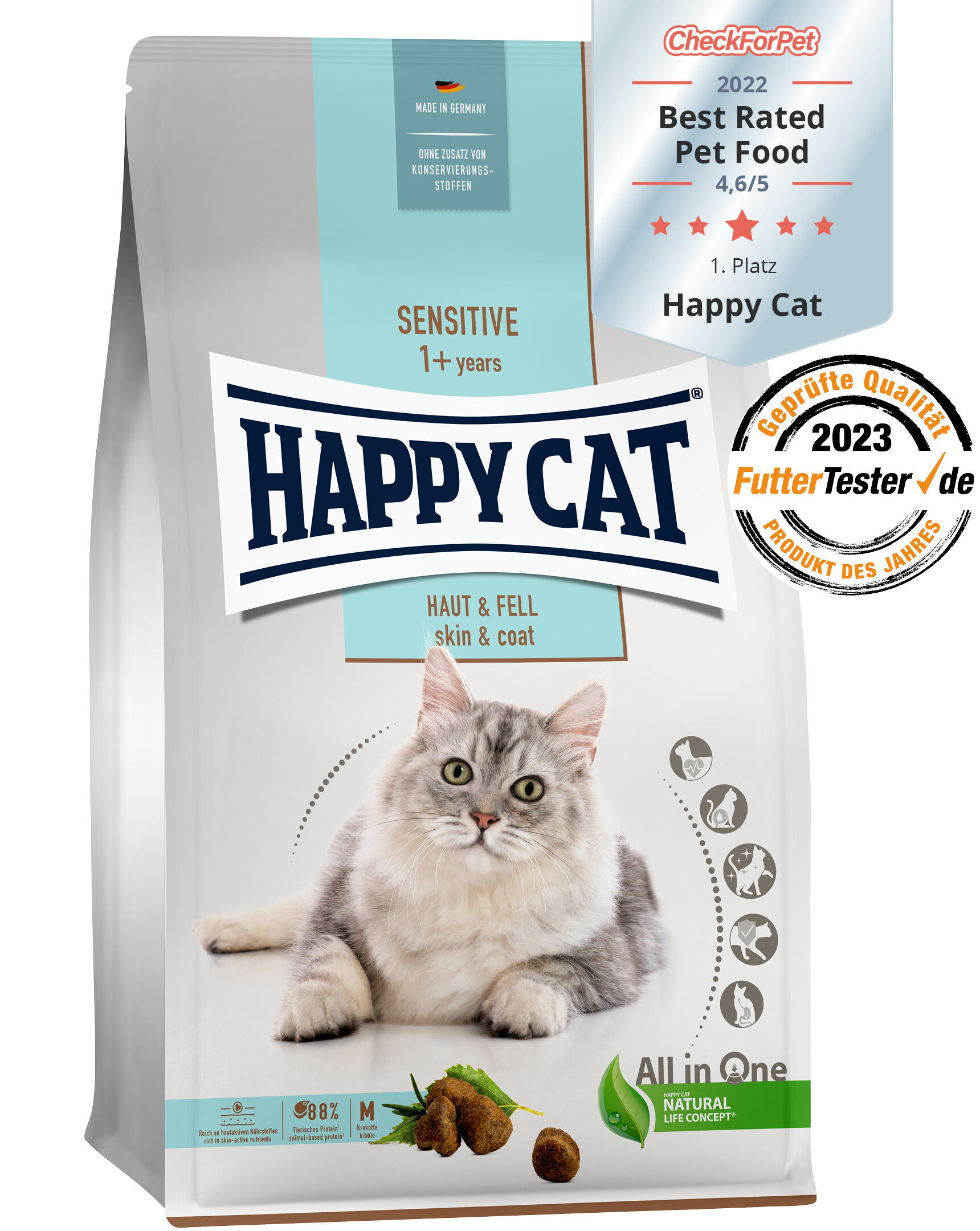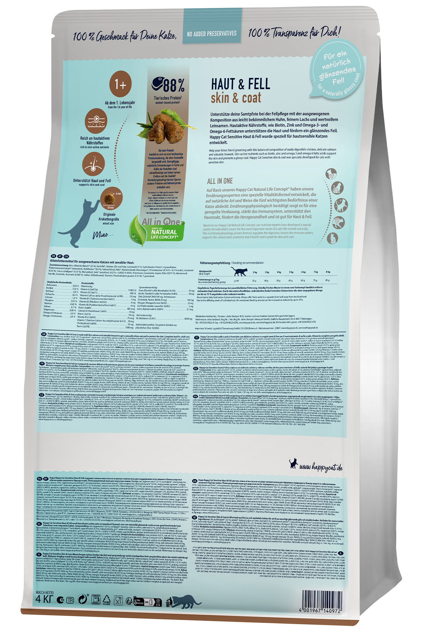 W niektórych fazach przydatne może być szczególne wsparcie skóry kota składnikami odżywczymi aktywnymi dla skóry. W chłodnych miesiącach zimowych, kiedy suche powietrze w okresie grzewczym obciąża sierść kota, zaleca się podawanie karmy Happy Cat Sensitive Haut & Fell (skóra i sierść). Również wiosną i jesienią, kiedy kot potrzebuje szczególnie wielu aktywnych dla skóry składników odżywczych witaminy A, witaminy B, biotyny i cynku przy zmianie sierści.