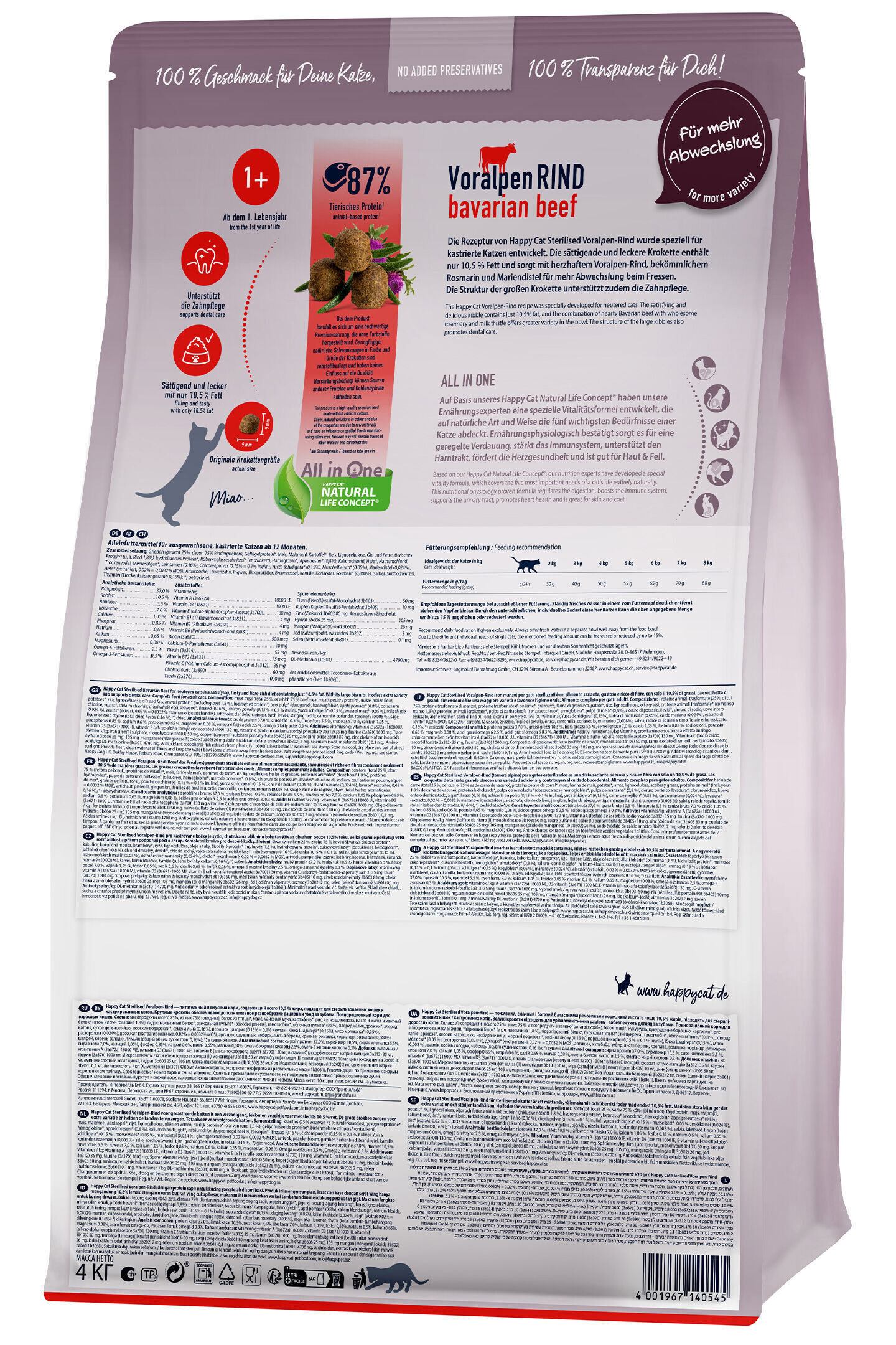 Receptura Happy Cat Sterilised Voralpen-Rind została specjalnie opracowana w celu zaspokojenia potrzeb żywieniowych wykastrowanych kotów. Sycące i smaczne krokiety zawierają tylko 10,5 % tłuszczu i urozmaicają posiłki, dzięki pożywnej wołowinie alpejskiej, pełnowartościowemu rozmarynowi i ostropestowi plamistemu.